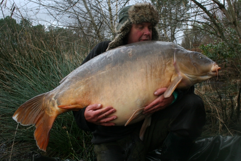 Alan recalls the struggle he had landing this huge mirror carp: "The session was already going well, when on Monday morning I noticed the left hand rod tip pull down, followed by the heavy bobbin dropping back. When I pulled into the fish, I could feel it running along the far side of a bar and so took to the boat immediately.